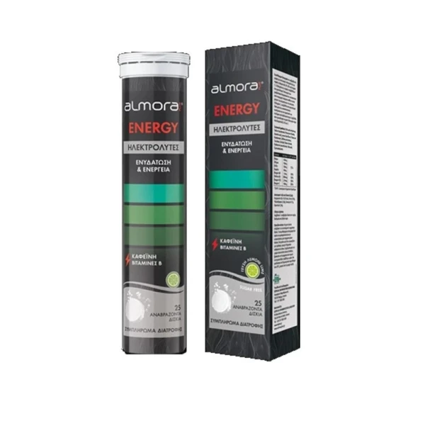 To almora Energy είναι συμπλήρωμα διατροφής σε αναβράζουσα μορφή με συνδυασμό ηλεκτρολυτών (Na, Cl, K), βιταμινών του συμπλέγματος B (Β6, Β9, Β12), καφεΐνης και Βιταμίνης C.
