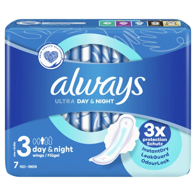 Οι σερβιέτες Always Ultra Day & Night Μέγεθος 3 με φτερά αξιοποιούν την τελευταία λέξη της τεχνολογίας, δημιουργώντας μια πολυλειτουργική σερβιέτα με 3 λειτουργίες προστασίας για ασφάλεια κατά τη διάρκεια της μέρας και της νύχτας. Το σύστημα InstantDry απορροφά τα υγρά σε δευτερόλεπτα και κρατά την υγρασία μακριά από την επιδερμίδα σας. Τεχνολογία LeakGuard που κλειδώνει τα υγρά και βοηθά στην πρόληψη των διαρροών.