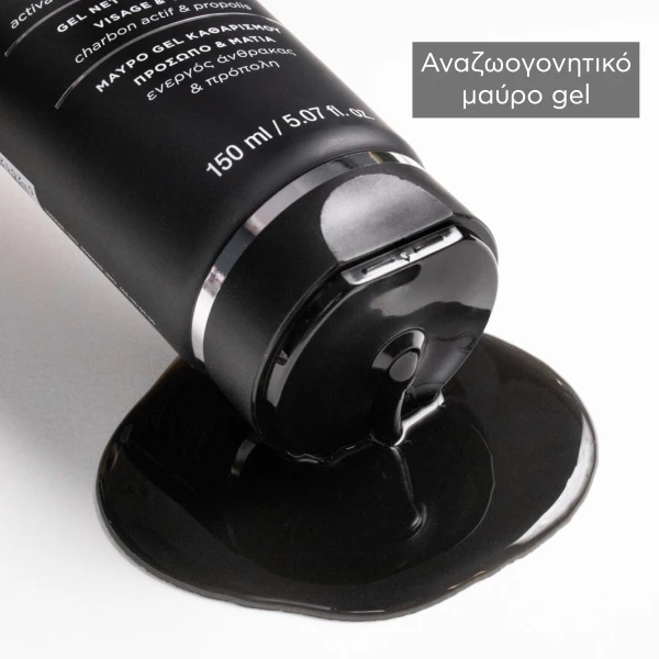 Μαύρο detox gel καθαρισμού με ενεργό άνθρακα και πρόπολη, που καθαρίζει αποτελεσματικά πρόσωπο και μάτια χωρίς να ερεθίζει.