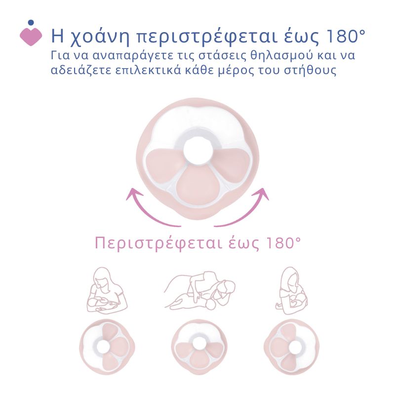 Η κεφαλή μπορεί να περιστραφεί έως και 180°, επιτρέποντας την αναπαραγωγή των διαφόρων θέσεων θηλασμού. Με αυτόν τον τρόπο, επιτυγχάνεται πλήρης εκκένωση όλων των περιοχών του μαστού και ανακούφιση από πιθανές δυσφορίες.