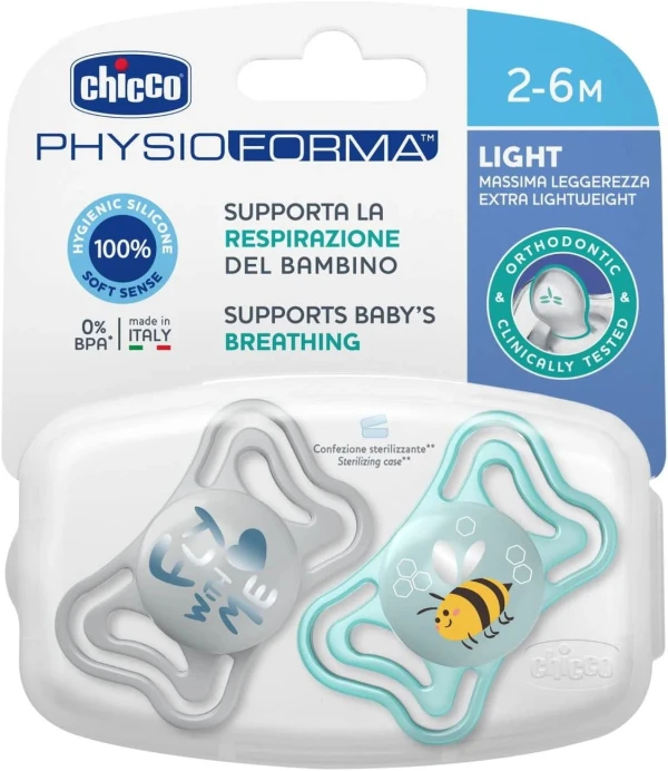 - Αποδεδειγμένες μελέτες έχουν δείξει ότι οι πιπίλες Chicco PhysioForma® εκπαιδεύουν όλες τις ζωτικές λειτουργίες του στόματος για υγιή ανάπτυξη: αναπνοή, πιπίλισμα, κατάποση, μάσημα και ομιλία.