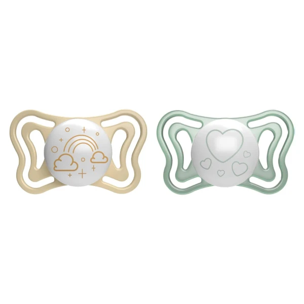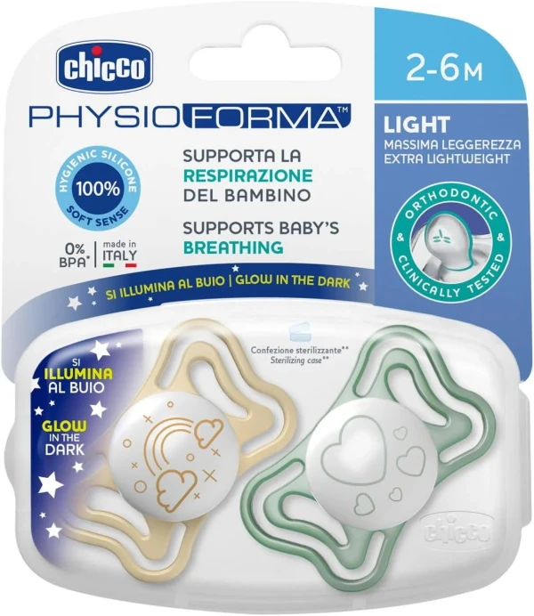 Chicco Πιπίλα Σιλικόνης PhysioForma Light Glow In The Dark Πράσινο/Μπεζ 2-6m, 2 τεμάχια