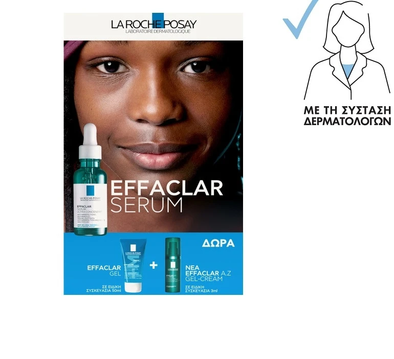 Ο ορός υψηλής συγκέντρωσης EFFACLAR Serum της La Roche-Posay είναι σχεδιασμένος με ένα σύμπλοκο απολεπιστικών οξέων συνδυασμένο με καταπραϋντική Νιασιναμίδη, που στοχεύει τα μαύρα στίγματα, τις ατέλειες, τα σημάδια και τους ορατούς πόρους της επιδερμίδας με τάση ακμής. Σε ειδική συσκευασία με Δώρο το Effaclar Gel 50ml αφρώδες τζελ καθαρισμού και εξυγίανσης, τώρα με το νέο δραστικό συστατικό Phylobioma, με τη δύναμη της επιστήμης του μικροβιώματος. Εξισορροπεί το pH του δέρματος. Μαζί, Δώρο και το NEO Effaclar A.Z Gel-Cream κατάλληλο για το ενήλικο δέραμ με τάση ακμής. Κλινικές μελέτες αποδεικνύουν ότι μειώνει τις επίμονες ατέλειες σε 7 ημέρες* και τις πρώτες ρυτίδες. Σύνθεσή ενισχυμένη με 3 οξέα που συστίνουν οι δερματολόγοι: 10% Αζελαϊκό , Σαλικυλικό και Υαλουρονικό Οξύ. * Κλινική μελέτη, 81 άτομα, εφαρμογή δύο φορές την ημέρα. La Roche Posay, 86270 La Roche-Posay France,