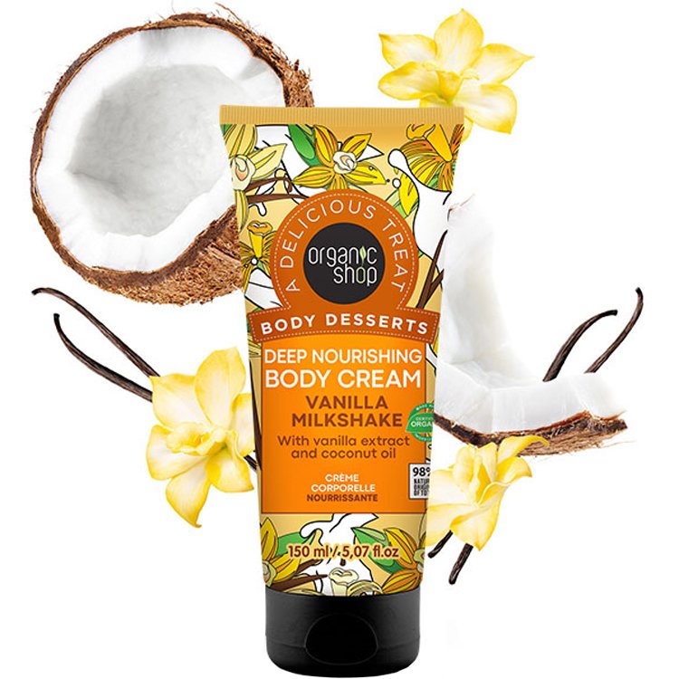 Organic Shop Body Desserts Vanilla Milkshake Deep Nourishing Body Cream Ενυδατική Κρέμα Σώματος με Εκχύλισμα Βανίλιας & Έλαιο Καρύδας με Γλυκό  Άρωμα Milkshake 150ml