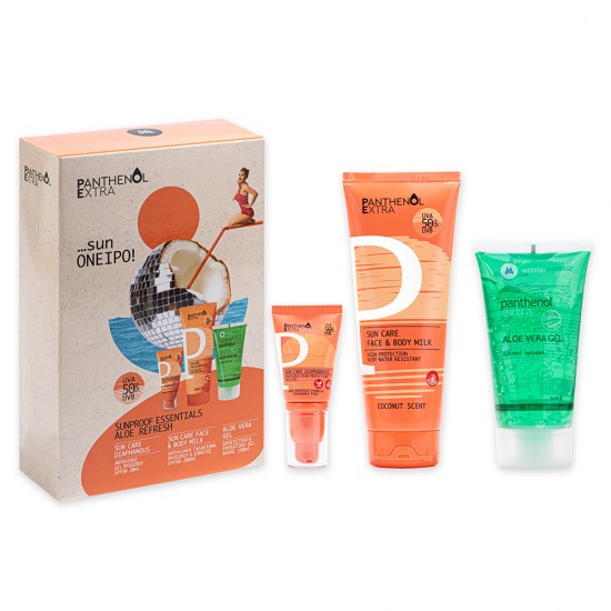 Το αντηλιακό σετ Sunproof Essentials Aloe Fresh της Panthenol Extra περιέχει ένα αντηλιακό gel προσώπου SPF50, ένα αντηλιακό γαλάκτωμα προσώπου-σώματος SPF50 και ένα Τζελ Αλόης με μαλακτική και καταπραϋντική δράση, και ένα μοναδικό νεσεσέρ που θα σας συνοδεύσουν στις καλοκαιρινές σας εξορμήσεις.