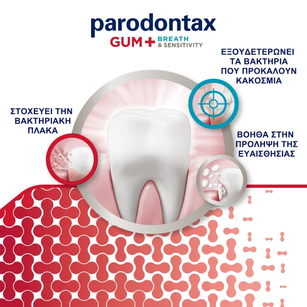 Η Parodontax Gum + Breath & Sensitivity είναι μια φθοριούχος οδοντόκρεμα καθημερινής χρήσης που είναι κλινικά αποδεδειγμένο ότι αντιμετωπίζει όχι μόνο τα προβλήματα των ούλων αλλά επίσης στοχεύει την δυσάρεστη αναπνοή και την ευαισθησία των δοντιών που αυτά μπορεί να προκαλέσουν.