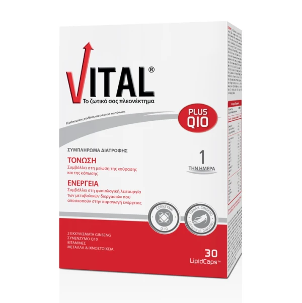 Συμπλήρωμα διατροφής με εκχυλίσματα ginseng, συνένζυμο Q10, 12 βιταμίνες, 11 μέταλλα και ιχνοστοιχεία που προσφέρει ενέργεια και τόνωση, αντιοξειδωτική προστασία