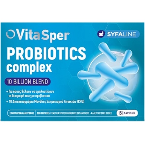 Διατροφικό συμπλήρωμα Probiotics Complex (10 Billion Blend) από τη VitaSper, με σύνθεση από δέκα δισεκατομμύρια μονάδες σχηματισμού αποικιών (CFU), Bifidobaterium animalis lactis, Bifidobacterium breve, Bifidobacterium bifidum, Bifidobacterium longum, Bifidum infantis, Lactobacillus reuteri, Lactobacillus gasseri, Lactobacillus acidophilus, Lactobacillus casei, Lactobacillus Plantarum, Lactobacillus rhamnosus, Lactobacillus bulgaricus, Bifidobacterium animalis, Lactobacillus fermentum, Lactobacillus salivarius, Enterococcus faecium, Lactoccocus lactis και Streptococcus thermophilus.